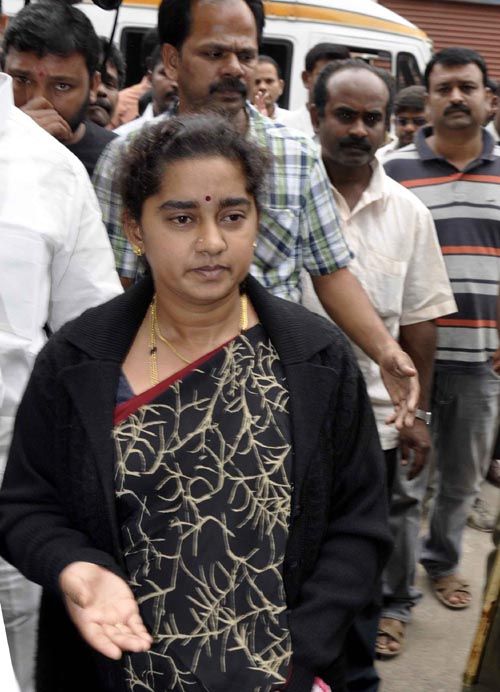 Gangula Bhanumati, wife of Maddelacheruvu Suri arrives at the Osmania Hospital where the doctors were performing an autopsy on the slain faction leader's body in Hyderabad on Tuesday. Suri's body was later handed over to his wife to be taken to Anantapur where the last rites would be performed on Wednesday. INN Photos