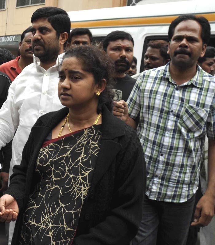Gangula Bhanumati, wife of Maddelacheruvu Suri arrives at the Osmania Hospital where the doctors were performing an autopsy on the slain faction leader's body in Hyderabad on Tuesday. Suri's body was later handed over to his wife to be taken to Anantapur where the last rites would be performed on Wednesday. INN Photos