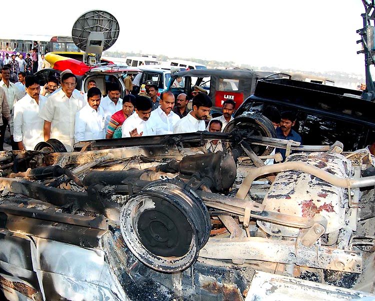 TDP Legislators from Seemandhra regions visit the Tank Bund in Hyderabad on Friday, where the statues of eminent Telugu personalities were desecrated and damaged by pro-Telangana agitators on Thursday during the Million March. INN Photos