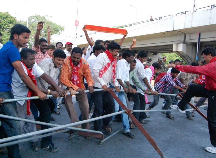 In a major show of strength, thousands of people violated ban orders and removed police barricades to assemble at Tank Bund area here on Thursday as part of the 'million march' for a separate Telangana state. The peaceful protest during the day was marred by incidents of violence in the evening. Protesters damaged some statues of Telugu leaders on Tank Bund, set afire a police vehicle and attacked a vehicle and crew of a television channel. -INN Photos