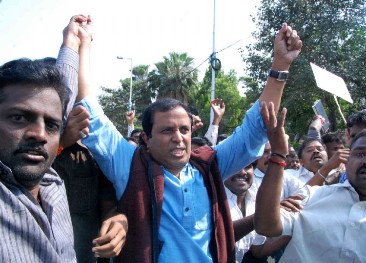 In a major show of strength, thousands of people violated ban orders and removed police barricades to assemble at Tank Bund area here on Thursday as part of the 'million march' for a separate Telangana state. The peaceful protest during the day was marred by incidents of violence in the evening. Protesters damaged some statues of Telugu leaders on Tank Bund, set afire a police vehicle and attacked a vehicle and crew of a television channel. -INN Photos