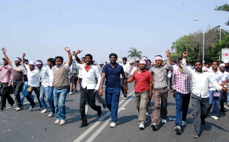 In a major show of strength, thousands of people violated ban orders and removed police barricades to assemble at Tank Bund area here on Thursday as part of the 'million march' for a separate Telangana state. The peaceful protest during the day was marred by incidents of violence in the evening. Protesters damaged some statues of Telugu leaders on Tank Bund, set afire a police vehicle and attacked a vehicle and crew of a television channel. -INN Photos