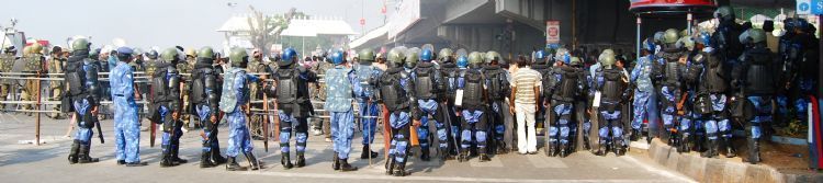 In a major show of strength, thousands of people violated ban orders and removed police barricades to assemble at Tank Bund area here on Thursday as part of the 'million march' for a separate Telangana state. The peaceful protest during the day was marred by incidents of violence in the evening. Protesters damaged some statues of Telugu leaders on Tank Bund, set afire a police vehicle and attacked a vehicle and crew of a television channel. -INN Photos