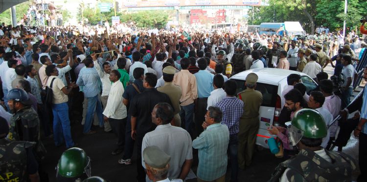 In a major show of strength, thousands of people violated ban orders and removed police barricades to assemble at Tank Bund area here on Thursday as part of the 'million march' for a separate Telangana state. The peaceful protest during the day was marred by incidents of violence in the evening. Protesters damaged some statues of Telugu leaders on Tank Bund, set afire a police vehicle and attacked a vehicle and crew of a television channel. -INN Photos