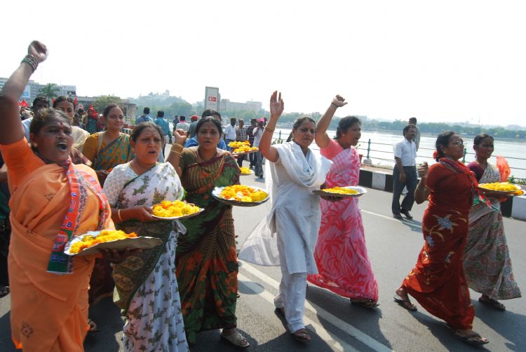 In a major show of strength, thousands of people violated ban orders and removed police barricades to assemble at Tank Bund area here on Thursday as part of the 'million march' for a separate Telangana state. The peaceful protest during the day was marred by incidents of violence in the evening. Protesters damaged some statues of Telugu leaders on Tank Bund, set afire a police vehicle and attacked a vehicle and crew of a television channel. -INN Photos