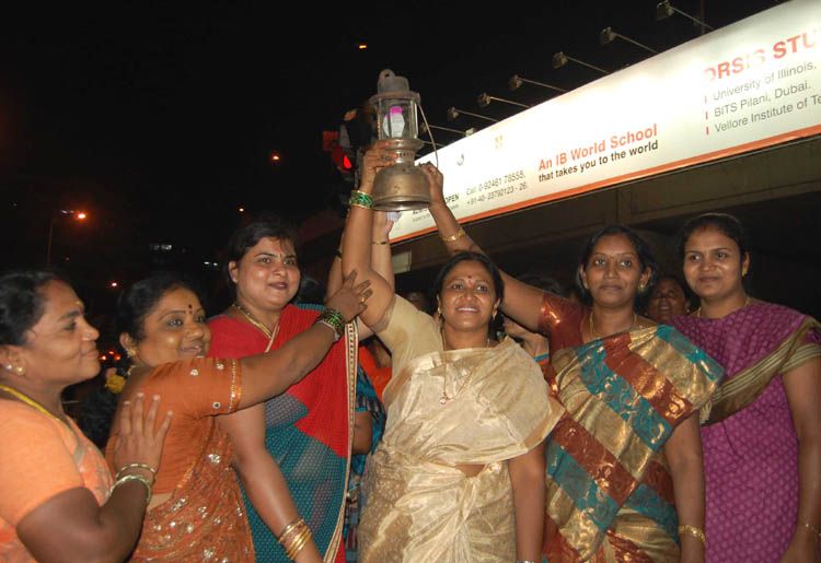 Activists of the Telugu Mahila stage a protest against the hike in electricity charges at Ambedker Statue, Tank Bund in Hyderabad on Thursday. INN Photos--