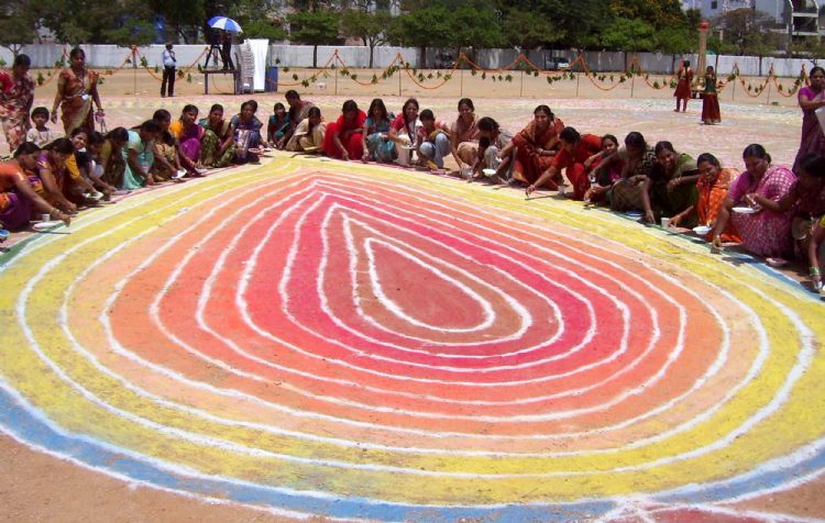 Women take part in a Rangoli competition organised on the eve of Telugu New Year Ugadi at NTR Stadium in Hyderabad on Sunday. INN Photos