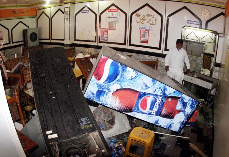 Omer Hotel, owned by Mohammed Pahelwan, the prime accused in the attack on the life of MIM Floor Leader in the state Assembly Akbaruddin Owaisi is ransacked by angry supporters of the MIM leader at Chandrayngutta in Hyderabad on Saturday. INN Photos