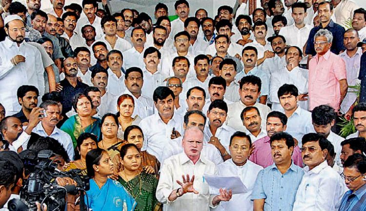 YSR Congress leader and MLA Pilli Subhashchandra Bose speaking to media along with Congress MLAs supporting YSR Congress party to announce their decision to resign from the State Assembly on Sunday in Hyderabad.