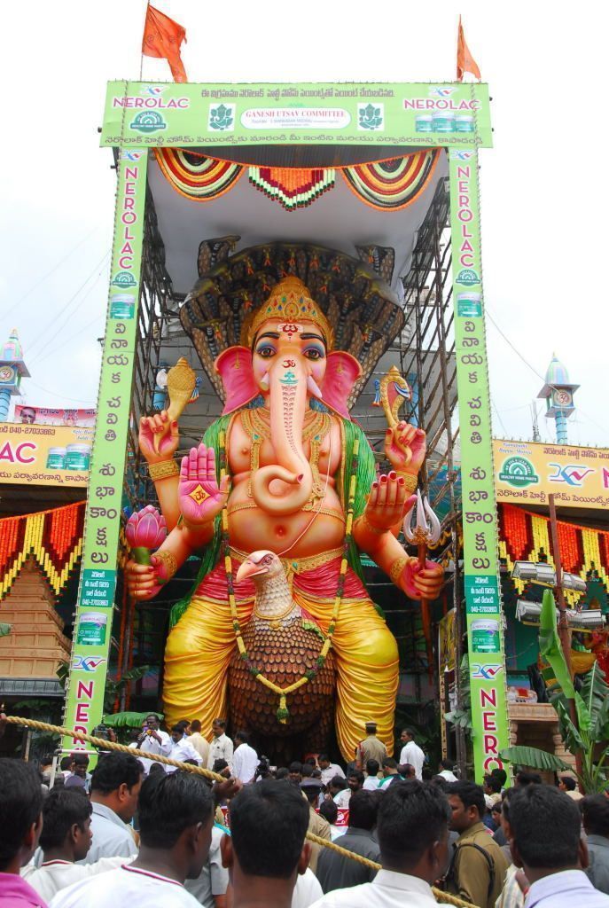 Thousand of devotees thronged at the state’s most popular Ganesh venue, Khairatabad Ganesh to witness the first prayers to their beloved deity on he first day of the festival here on Thursday morning. Governor ESL Narashimhan, along with his wife Vimala Narashimhan, participated in the prathisthapana programme and performed the first special pooja to the deity.