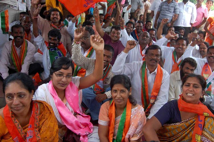 BJP activists squat on rail tracks as part of Rail Roko on Saturday at Moula Ali station near Secunderabad.