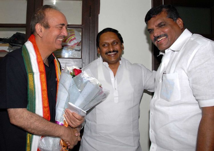 Union Healt minister Ghulam Nabi Azad arrives at Gandhi Bhavan here on Saturday to attend the Congress Coordination Committee meeting. Chief Minister N Kiran Kumar Reddy, PCC president Botsa Satyanarayana share a lighter moment with Azad. - INN Photos
