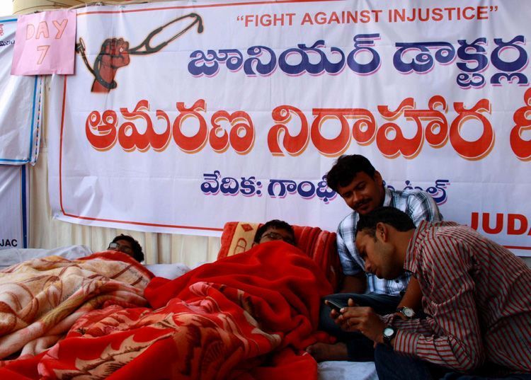 Striking Junior Doctors on indefinite hunger strike at Gandhi Hospital here on Tuesday.