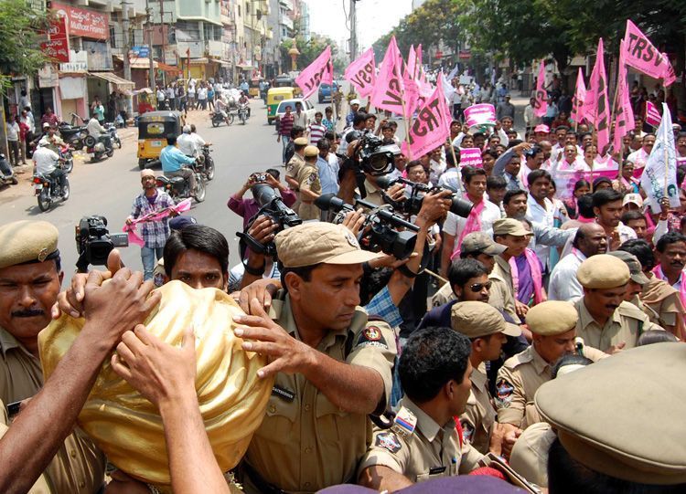 Police prevents TRS activists from desecrating NTR statue during a rally from Sundaraiah Vignana Kendram to Indira Park here on Friday - INN Photos