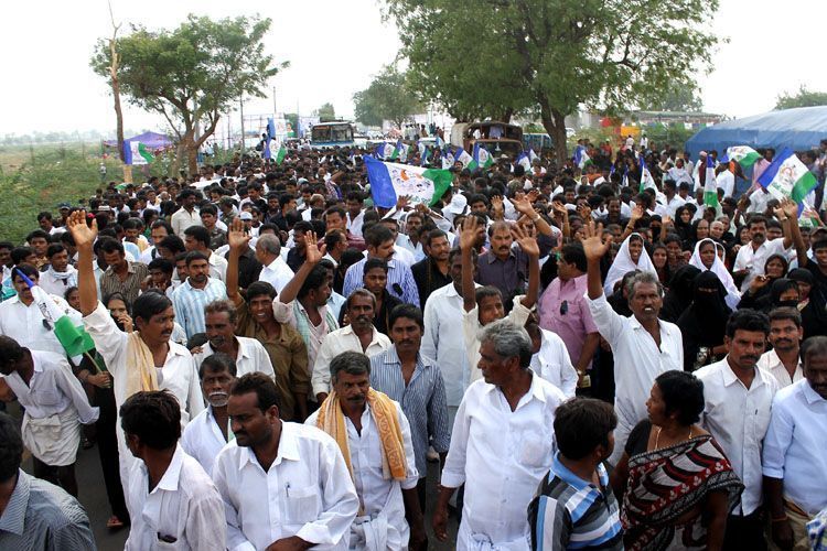 Sharmila talking to women, children as part of a mass contact programme with villagers in her second day of walkathon which began from the outskirts of Vempalli in Kadapa district on Friday.
