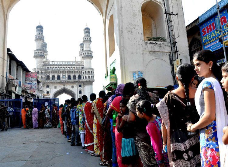 Devotees form long queues to offer pooja at Bhagyalakshmi temple abutting Charminar while the City Police allowed general traffic around the monument after three days on Wednesday - INN Photos