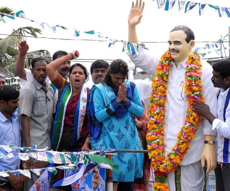Sharmila paying tributes to her father Dr.YS Rajasekhara Reddy after unveiling his statue at Miryalaguda in Nalgonda district on Saturday during her padayatra.