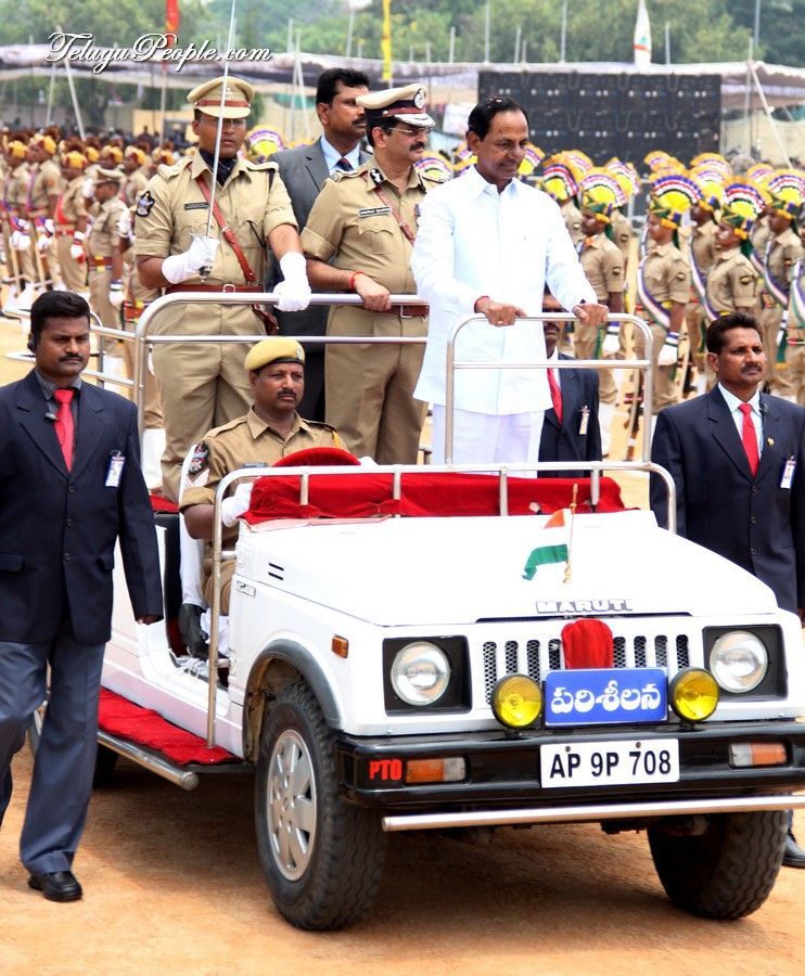 First Chief Minister of New State Telangana K Chandershekar Rao taking salute from police and armed reserve forces at a specially held parade at Parade Grounds in Secunderabad on Monday.