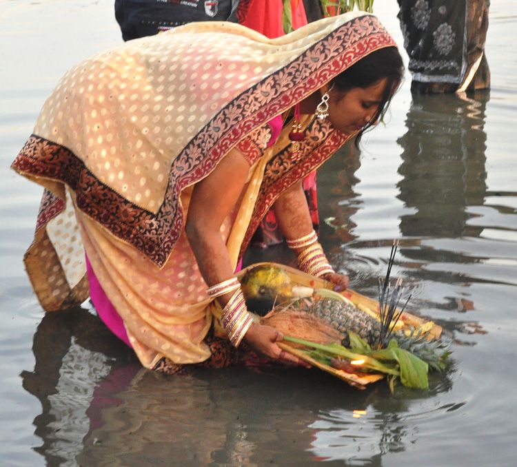 Jain women offering prayers to Sun God at Hussain Sagar lake in Hyderabad on Wednesday on the eve of Chhath festival.