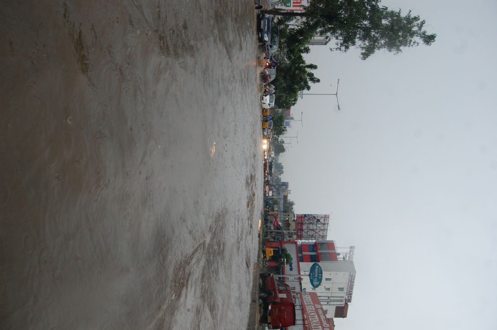 Pedestrians walk through the flooded streets after heavy rain lashed Hyderabad on June 12, 2015.