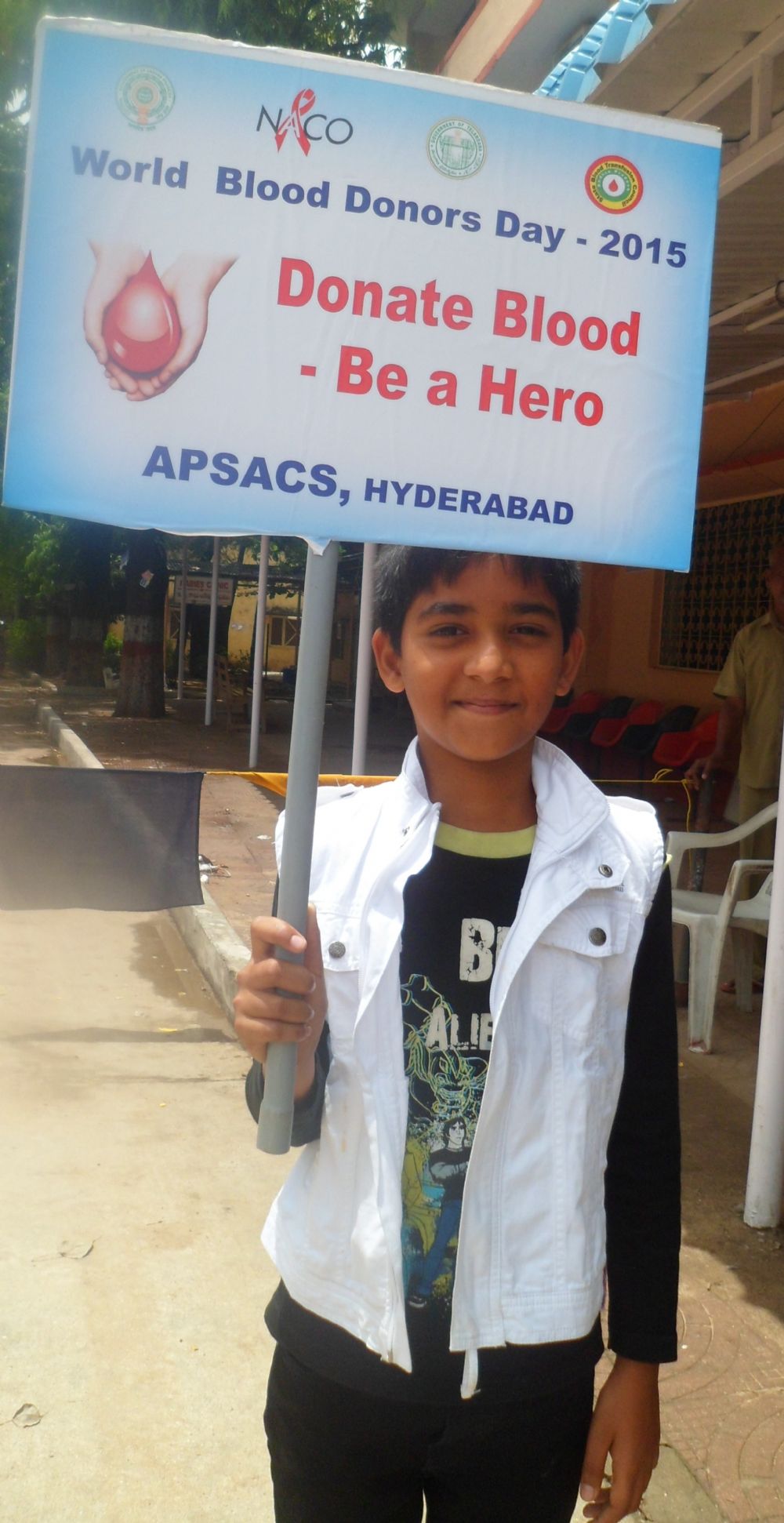 World Blood Donor Day was observed on 14th June.15, Rally started at YMCA, Narayanguda with about 300 students that was flagged off by Dr. Amarinder Reddy, Director, IPM, Dr. Padmaja, DM & HO, Hyderabad and Dr. Satyanarayana Reddy, State Liaision Officer, NSS, followed by a meeting, which was organized by State AIDS Control Society, Andhra Pradesh and Telangana in association with State blood Transfusion Council, Hyderabad.