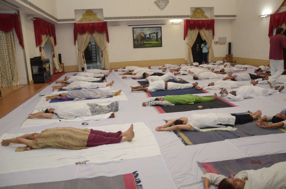 Governor of Telangana and Andhra Pradesh E.S.L. Narasimhan taking the lead in organising the first International Yoga Day celebrations at Raj Bhavan in Hyderabad on Sunday.