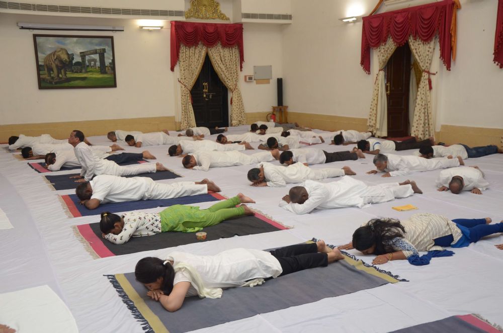 Governor of Telangana and Andhra Pradesh E.S.L. Narasimhan taking the lead in organising the first International Yoga Day celebrations at Raj Bhavan in Hyderabad on Sunday.