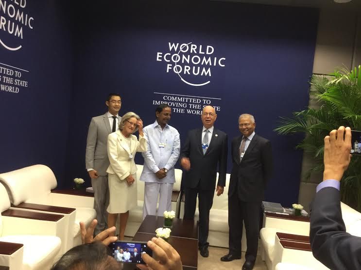 Chief Minister K.Chandrashekhar Rao with the Founder & Chairman of World Economic Forum. Mr. Klaus Schwab at World Economic Forum, China on 9th September 2015.