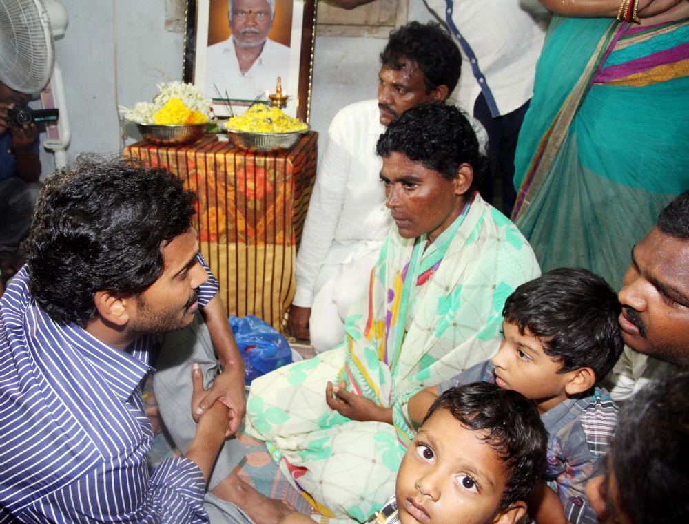 YS Jagan Mohan Reddy consoling the family members of tobacco farmers who committed suicide in Prakasham District and addressing the public at tobacco auction center in Tanguturu on 1st October 2015.