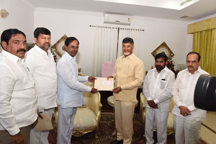 Chandra Babu Naidu, CM, Andhra Pradesh is seen inviting K.Chandra Sekhara Rao, CM, Telangana for the foundation stone ceremony of 'Amaravathi' in the residence of KCR on Sunday.