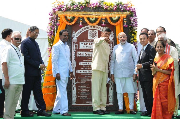 Narendra Modi Prime Minister of India seen Laying foundation stone for the New Capital City (Amaravati) of Andhra Pradesh at Uddandurayanupalem, Guntur District. Sri E.S.L. Narasimhan Governor, N.Chandrababu Naidu Chief Minister of AP & K.Chandrasekhar Rao Chief Minister of Telangana and other Dignitaries are also seen