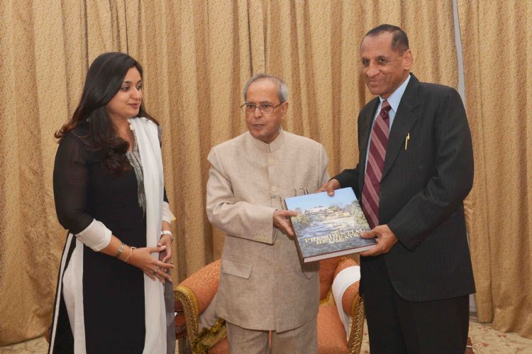 President of India Pranab Mukherjee is seen releasing a book titled on 'The Presidential of Retreats of India' at Rastrapathi Nilayam on 21st December 2015. E.S.L.Narasimhan, Governor and Ms.Anuradha Nayak are also seen.