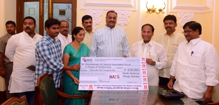 NATS india co coordinator Ratish Adusumilli with the help of other NRIs collected Rs 9,50,000 and donated it to the Pujitha's parents. Pujitha is a B.Tech student, who got seriously injured in an accident last year. Andhra Pradesh assembly speaker handed over the cheque to the victim's family at speaker's office on Tuesday.