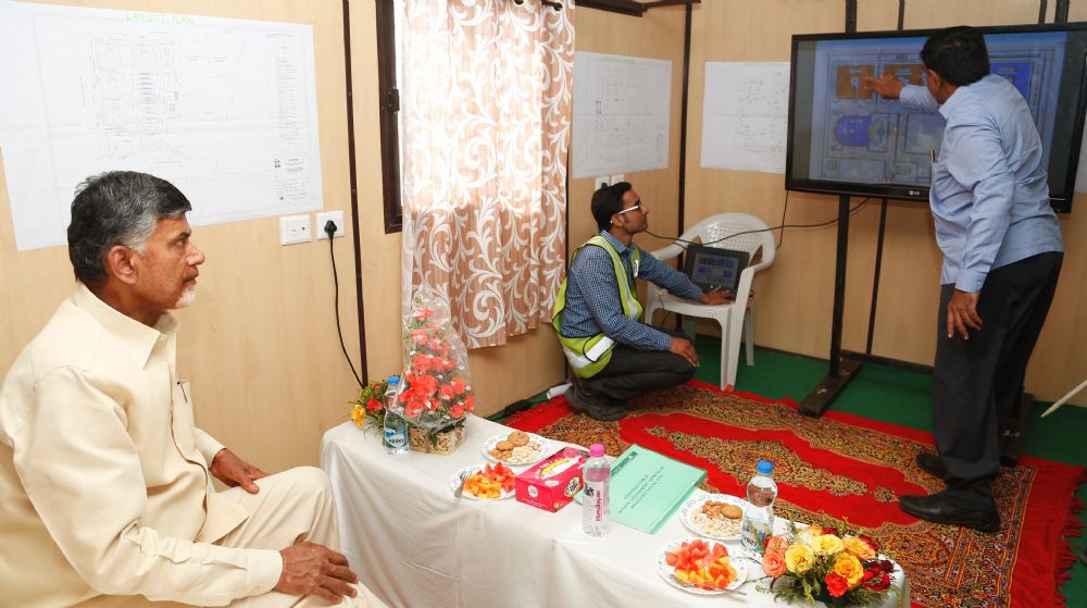 Andhra Pradesh Chief Minister N. Chandrababu Naidu inspects the ongoing temporary Secretariat work at Velagapudi village in Guntur District on 25th March 2016.