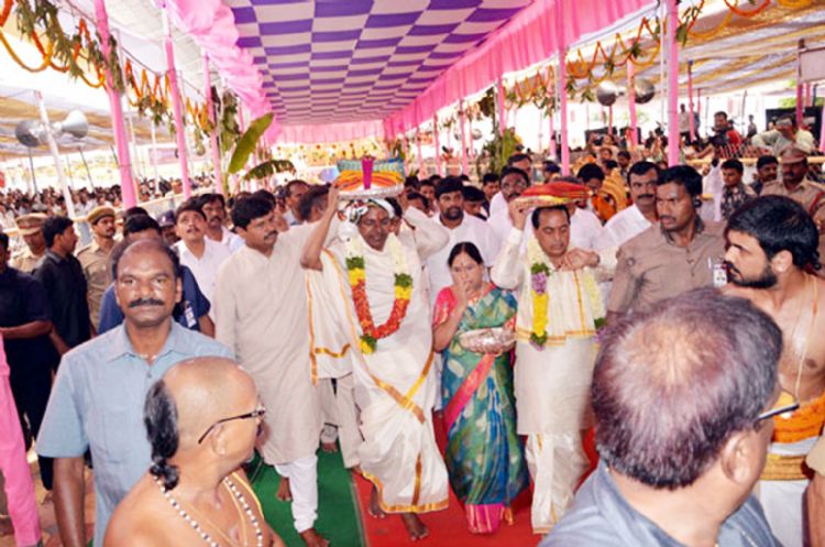 Telangana Chief Minister K.Chandrasekhar Rao along with his wife presented Pattu Vastrams to Bhadrachalam lord Sri Rama on behalf of Telangana government on Friday on the occasion of Sri Rama Navami.
