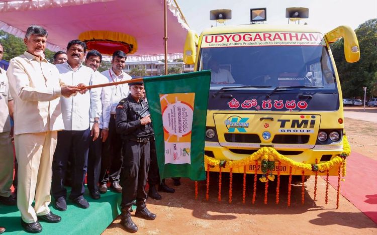 Andhra Pradesh Chief Minister N. Chandrababu Naidu flagged off the Udyogaratham, a mobile skill development centre, which will provide information to rural youth on the employment opportunities in the MSME sector.