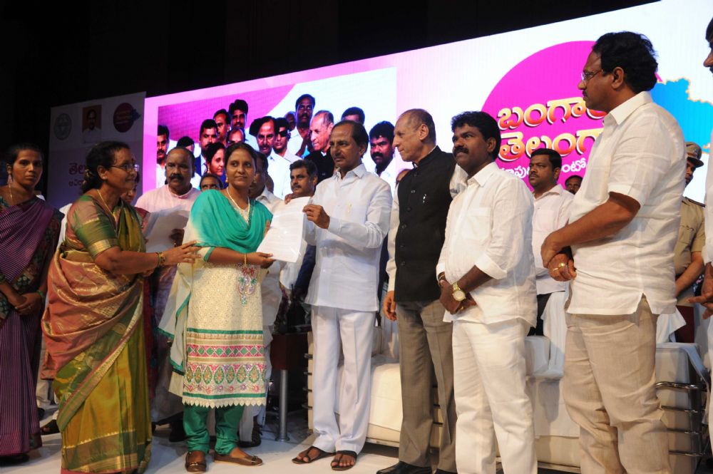 Governor ESL. Narasimhan and Chief Minister K. Chandrashekhar Rao Presenting Telangana State level Awards-2016 to the Awardees and Appointment Orders at the Special meeting of Telangana State Formation Day Celebrations at HICC, Madhapur on 2nd June 2016.