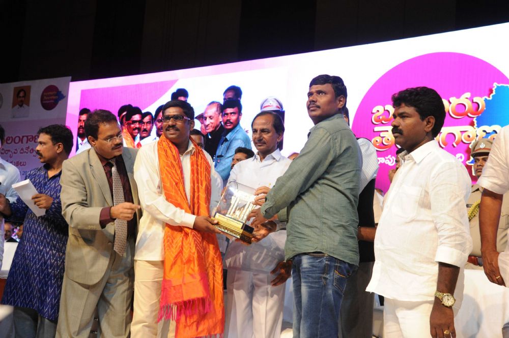 Governor ESL. Narasimhan and Chief Minister K. Chandrashekhar Rao Presenting Telangana State level Awards-2016 to the Awardees and Appointment Orders at the Special meeting of Telangana State Formation Day Celebrations at HICC, Madhapur on 2nd June 2016.