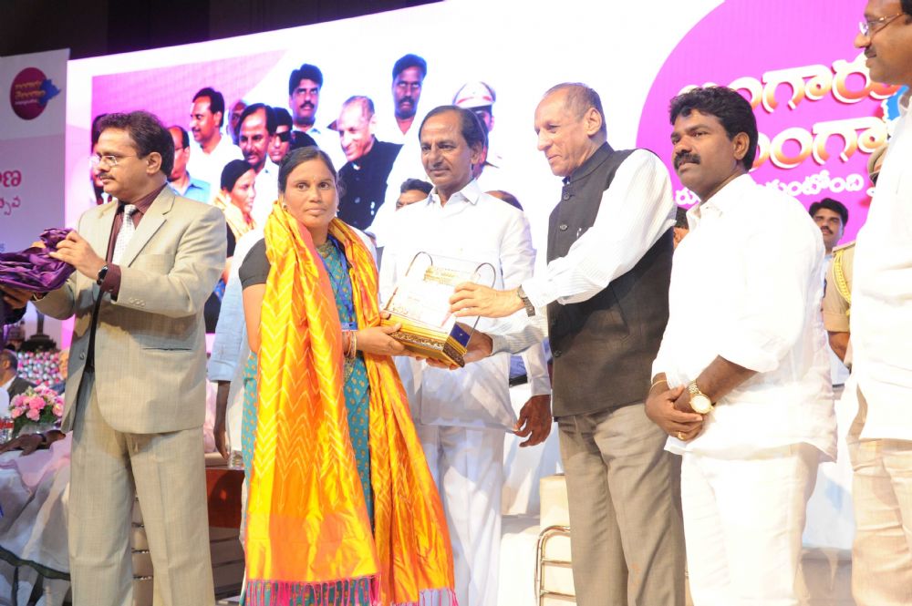 Governor ESL. Narasimhan and Chief Minister K. Chandrashekhar Rao Presenting Telangana State level Awards-2016 to the Awardees and Appointment Orders at the Special meeting of Telangana State Formation Day Celebrations at HICC, Madhapur on 2nd June 2016.