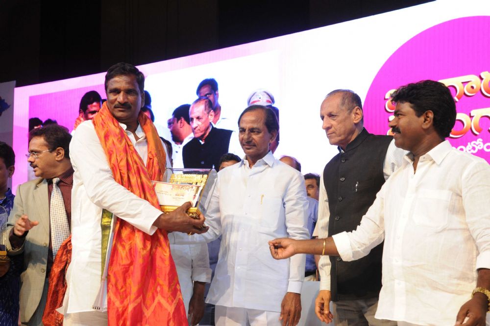 Governor ESL. Narasimhan and Chief Minister K. Chandrashekhar Rao Presenting Telangana State level Awards-2016 to the Awardees and Appointment Orders at the Special meeting of Telangana State Formation Day Celebrations at HICC, Madhapur on 2nd June 2016.