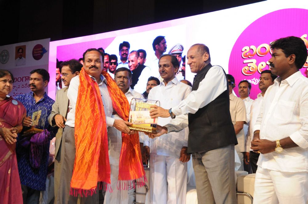 Governor ESL. Narasimhan and Chief Minister K. Chandrashekhar Rao Presenting Telangana State level Awards-2016 to the Awardees and Appointment Orders at the Special meeting of Telangana State Formation Day Celebrations at HICC, Madhapur on 2nd June 2016.