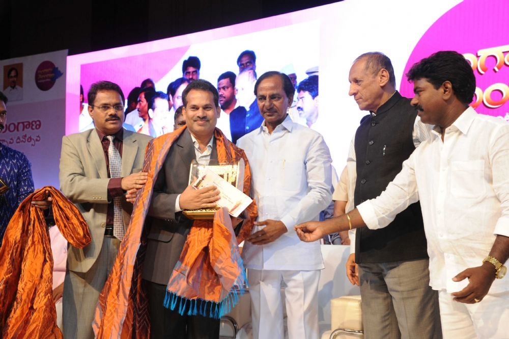 Governor ESL. Narasimhan and Chief Minister K. Chandrashekhar Rao Presenting Telangana State level Awards-2016 to the Awardees and Appointment Orders at the Special meeting of Telangana State Formation Day Celebrations at HICC, Madhapur on 2nd June 2016.