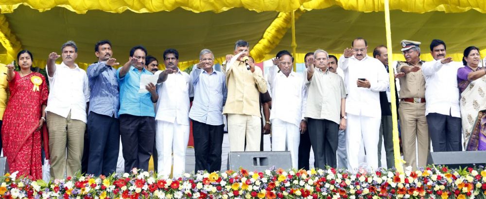 Andhra Pradesh Chief Minister N. Chandrababu Naidu, Speaker Kodela Siva Prasad, TDP Leaders along with Public took an oath at the Nava Nirmana Deeksha in Vijayawada, Striving for the Development of AP State on 2nd June 2016.