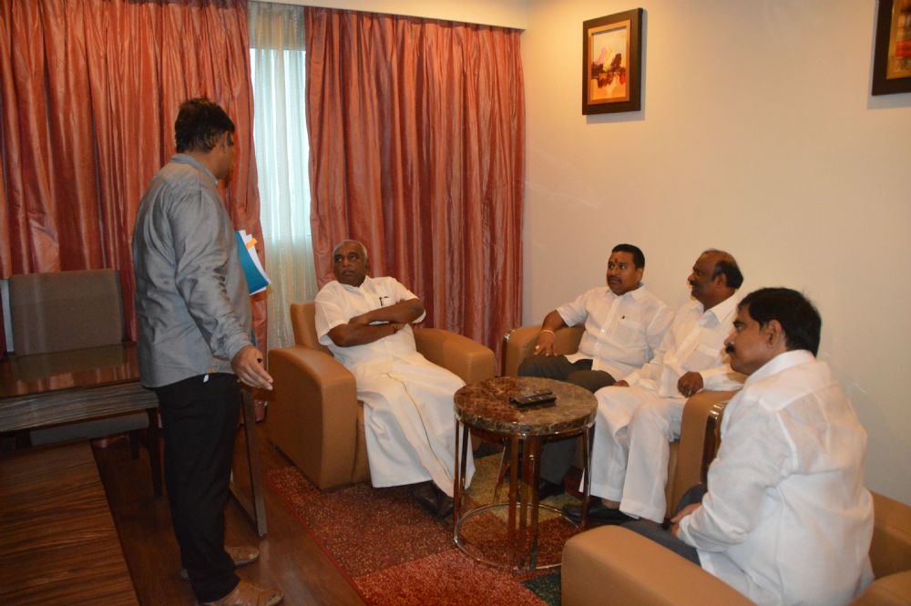Andhra Pradesh Irrigation Minister Devineni Uma Maheswara Rao receiving RADHAKRISHNAN, Union Minister of State for Road, Transport, Highways & Shipping in Vijayawada Railway Station on7th June 2016.