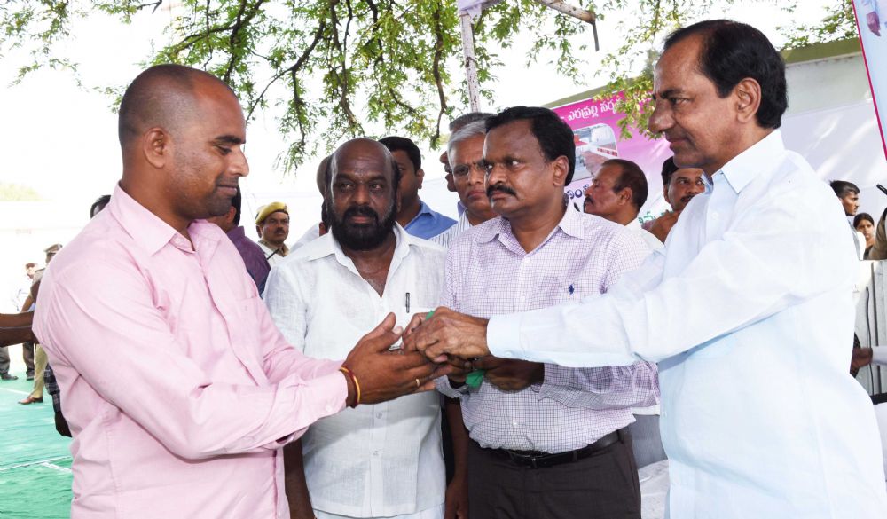 Chief Minister K. Chandrashekhar Rao distributing Tractors and participated in public meeting at Erravalli and Narsannapet villages of Jagdevpur mandal of Medak district on 10th June 2016.