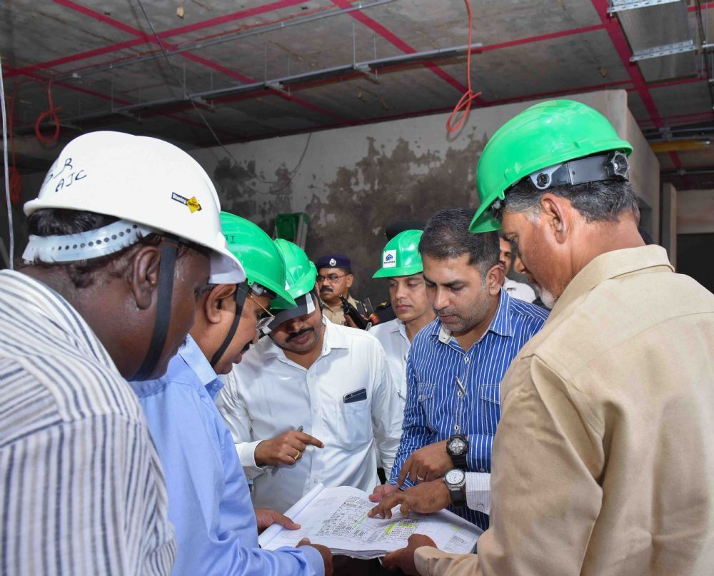 Andhra Pradesh Chief Minister N. Chandrababu Naidu inspecting the on going Secretariat building works in Velagapudi on 15th June 2016.