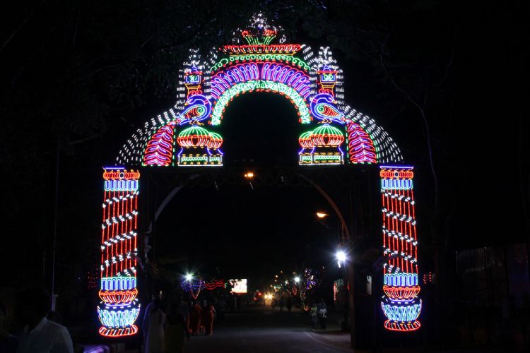 The huge electrical bill boards depicting the colorful profiles of Hindu deities and spectacular scenes from mythological legends are a special feature of the ongoing salakatla Brahmotsavam.