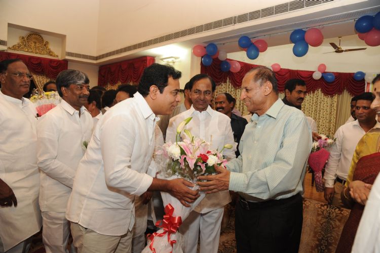 Telangana Chief Minister K. Chandrasekhar Rao and IT Minister K. Taraka Rama Rao congratulating Governor ESL Narasimhan on his Birthday at Rajbhavan in Hyderabad on 4th November 2016.