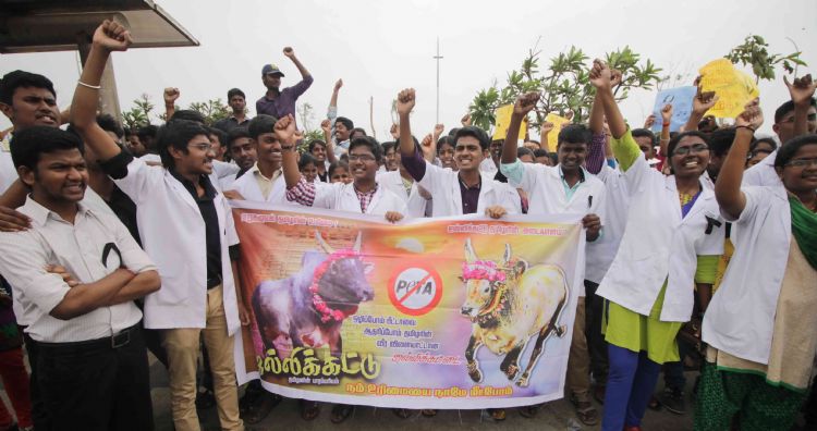 A large number of Students and People gather near Chennai's Marina Beach to support traditional Jallikattu on 20th January 2017.