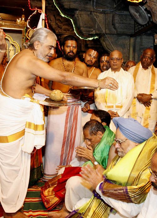 Prime Minister receiveing Vedic Asirwachanam from Chief Priest of Tirumala shrine Ramana Deekshitulu